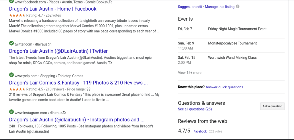 These 4 simple things will give you a nice web presence and increase your SEO. How you may ask? If you’re active on social, claim you pages, and have a website, you’ll show at the top of Google search for all three. Take this local company, for example, (I’ve done no work for them just like them). Dragon’s Lair Comics.